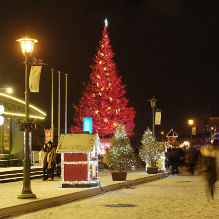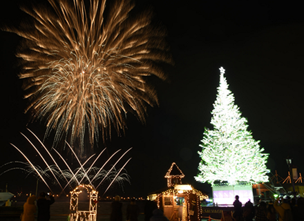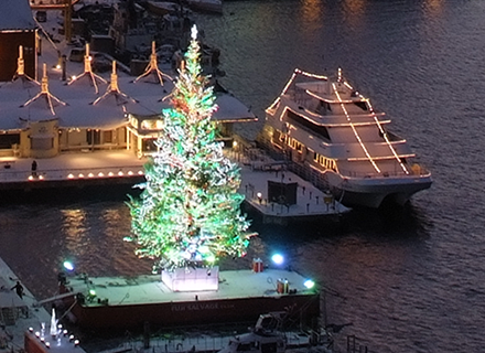そして、今年もカナダからすてきなプレゼント。大きなクリスマスツリーがやってきます。函館港の海上に浮かぶ美しいツリーの幻想的な姿は、今や函館の冬の風物詩。