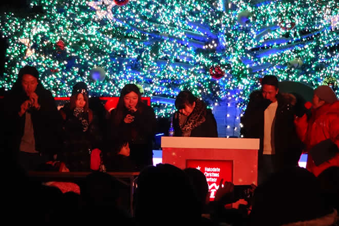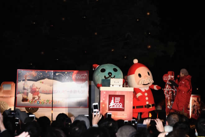 ステージ上ではサンタのニッキーもお手伝い。いよいよ点灯です。