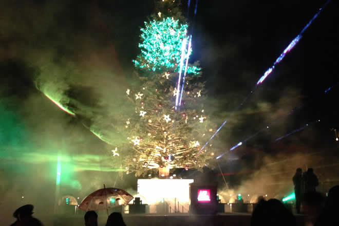 点灯式の前には、小雨の降る中、ツリーとレーザーの幻想的なショーが行われました。