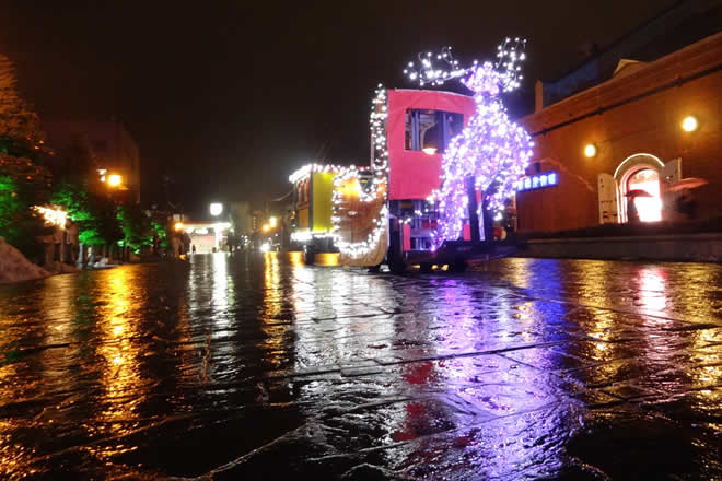 石畳にイルミネーションが反射し、いつもより光の量が多く感じられます。
