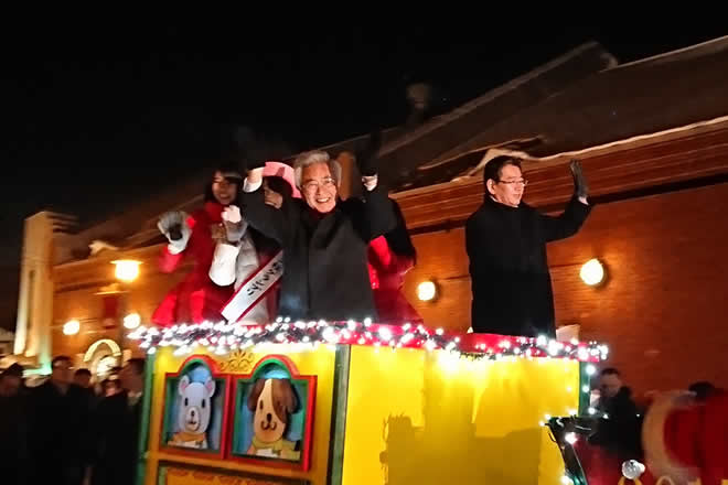 本日の点灯者、弘前市長、函館副市長、弘前城ミス桜、りんご娘さんがソリにのって登場です。